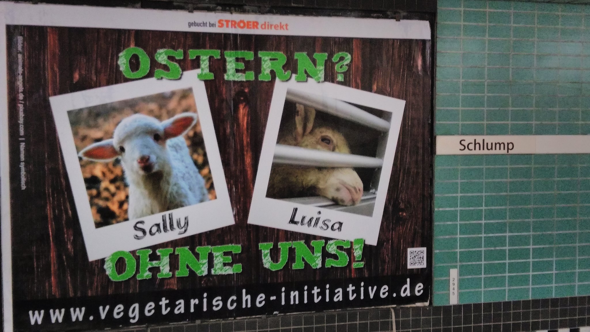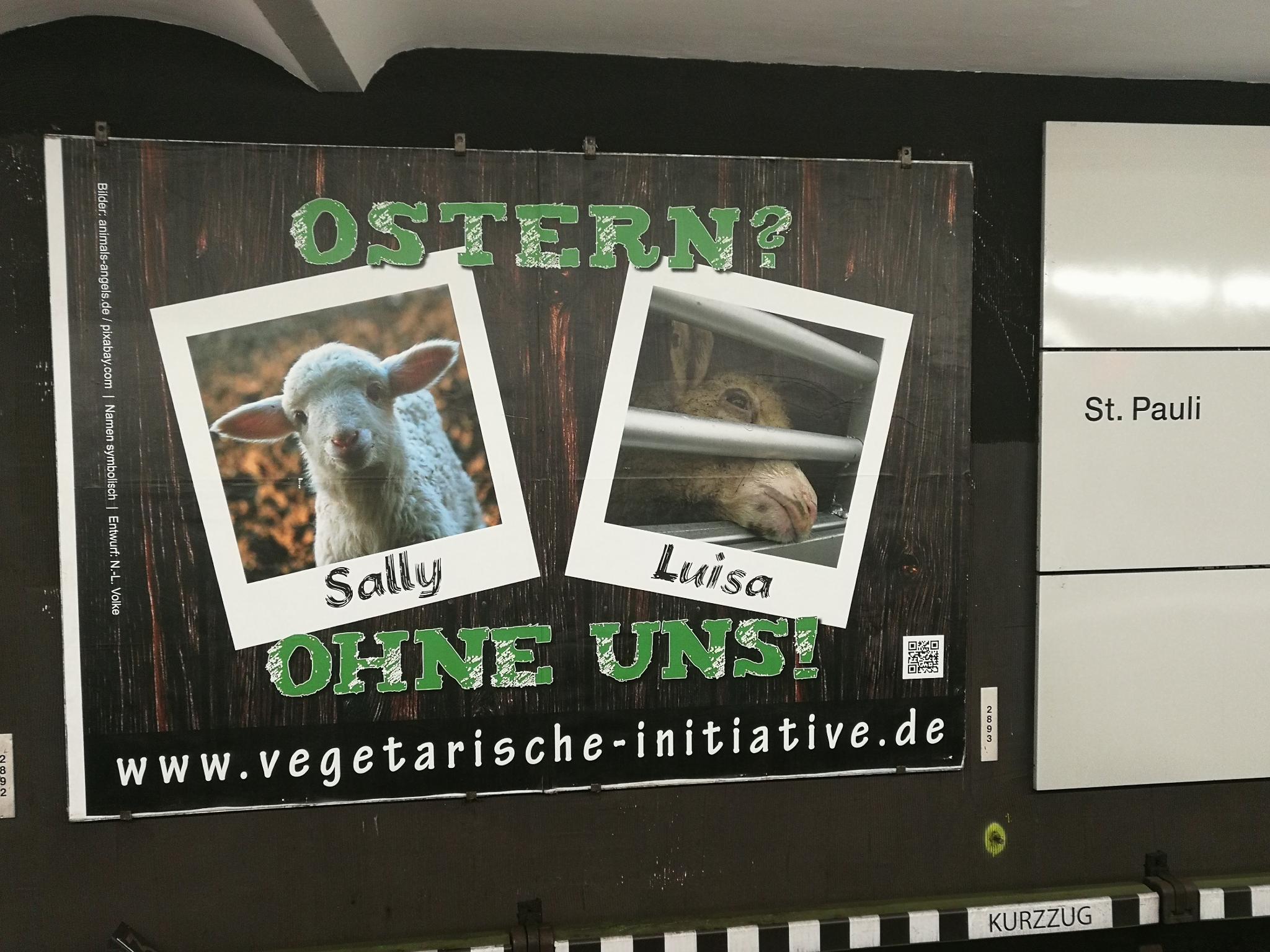 Wir starteten wieder eine Oster-Plakataktion in HAMBURG! Im Zeitraum 3.4.- 13.4.2020 (S-Bf Holstenstr. Gleis 4) und 7.4.-13.4.2020 (Hbf Gleis 3) rückte unser bewährtes Großplakat "OSTERN? OHNE UNS!" das Leid der Osterlämmer in den Fokus.
