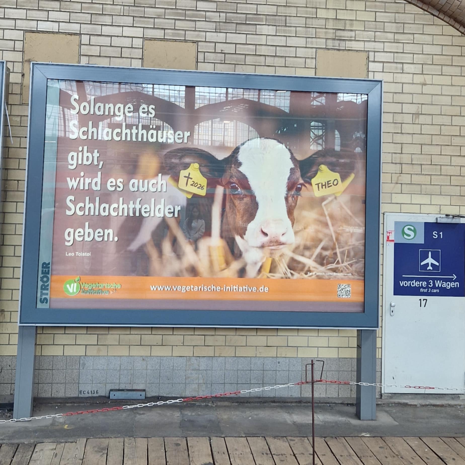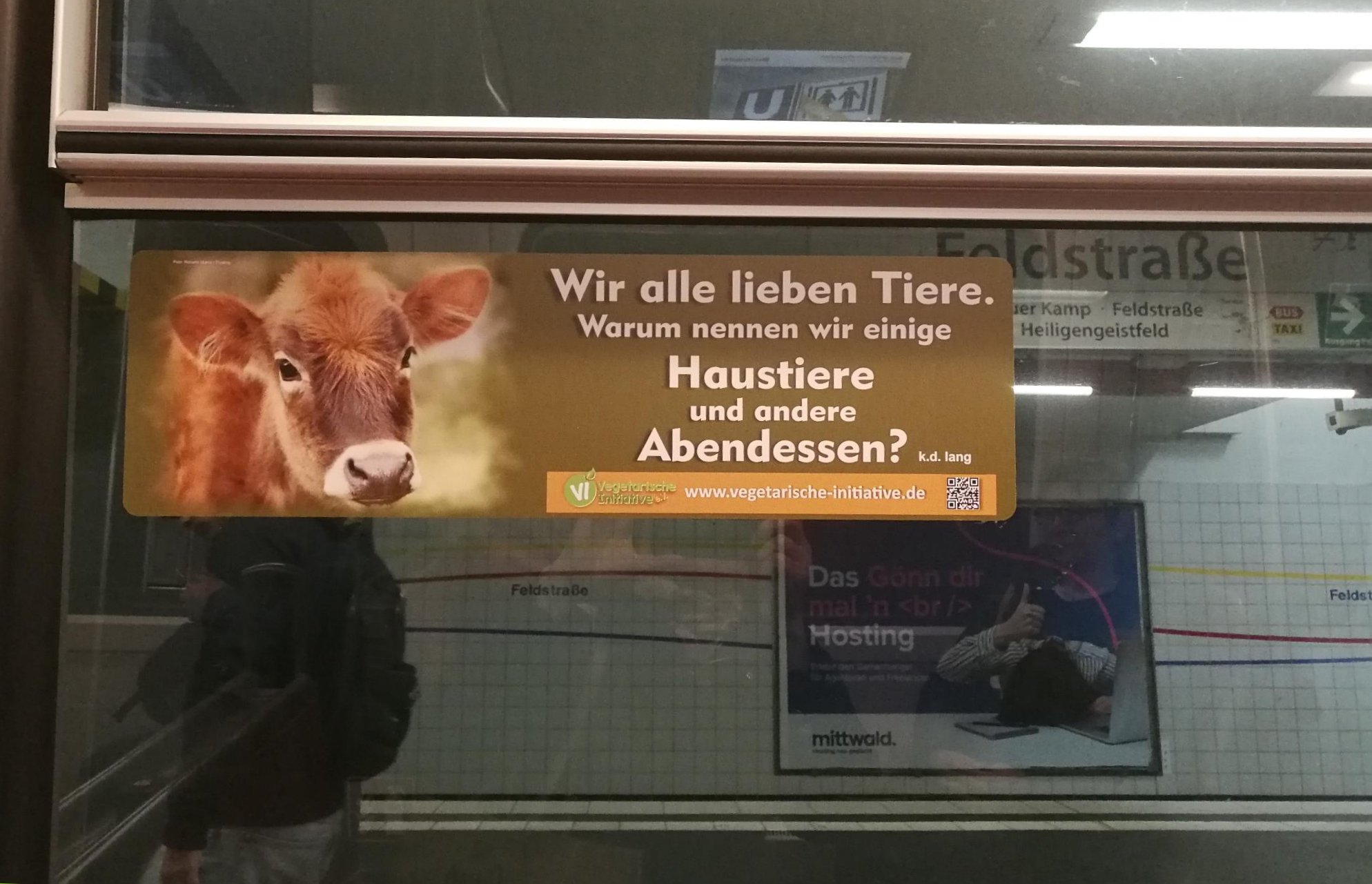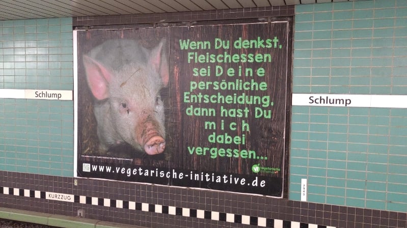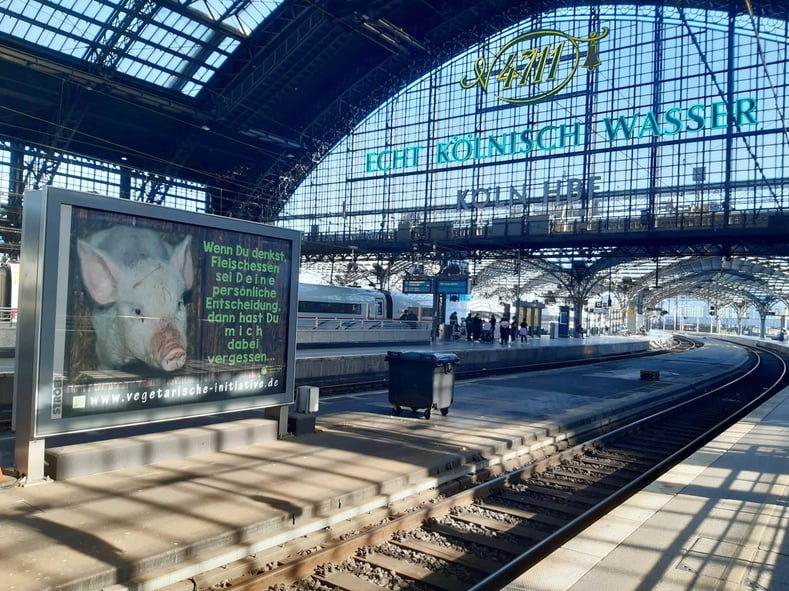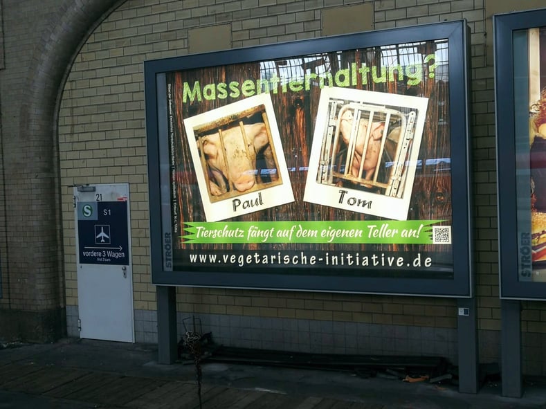 Vom 15.-21.12.2020 erstrahlt unsere Großplakatwand als großes, sich bewegendes Megalight-Plakat in der großen Halle des Hbf Hamburg, Gleis 3, (S1 Richtung Airport / Poppenbüttel)! Das Thema: "Massentierhaltung? Tierschutz fängt auf dem eigenen Teller an!" ist nach wie vor aktuell - und müsste am liebsten auf allen Megalight-Plakaten im ganzen Hauptbahnhof und natürlich bundesweit in allen Städten zu sehen sein... Think big!