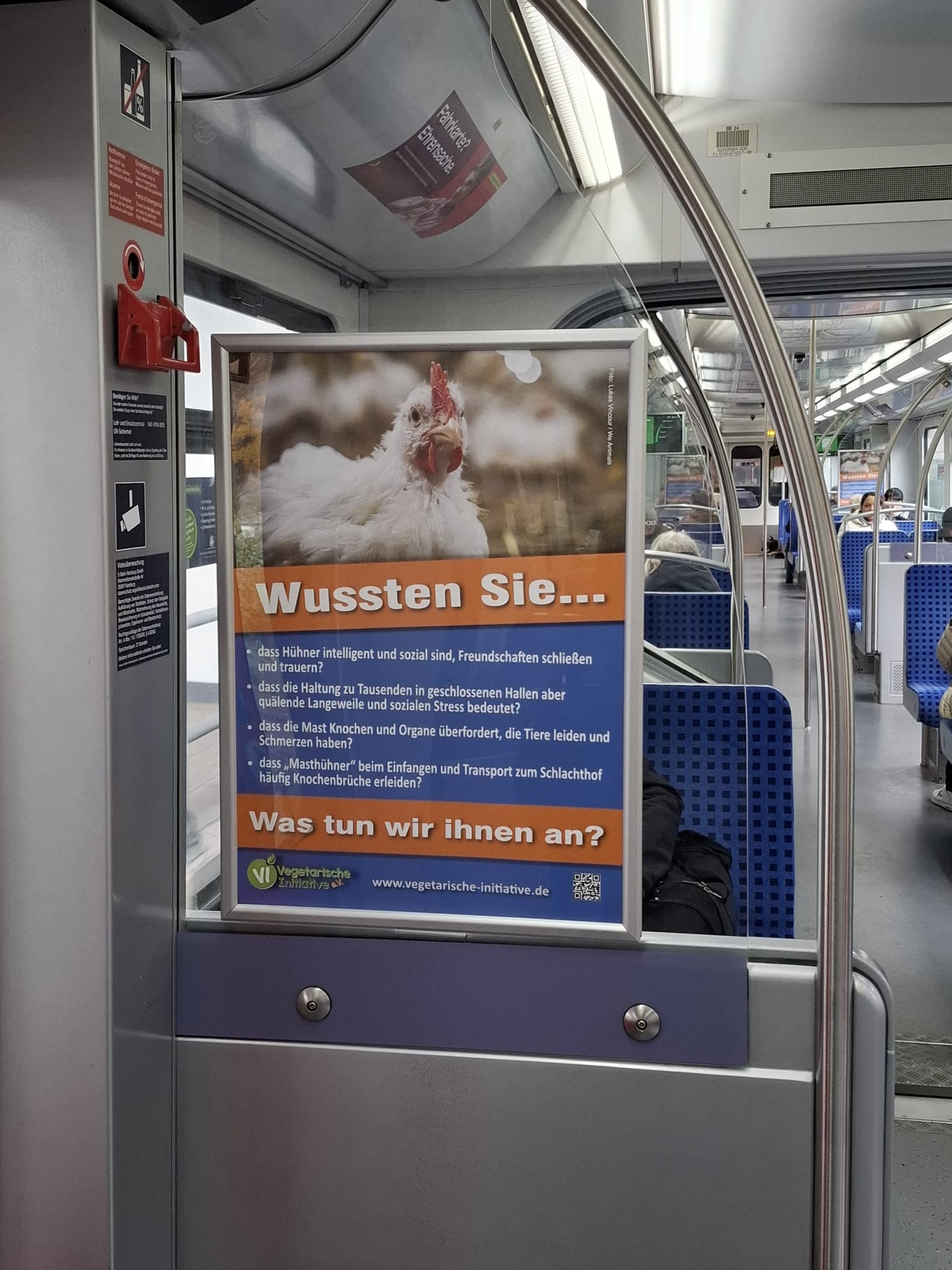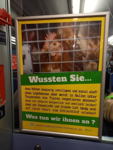 Plakate in der Größe A2 sollen in Hamburger S-Bahnen vom 1. bis 30.11.2025 auf das maßlose Leid der lebenslang eingesperrten Masthühner (und -hähne) aufmerksam machen.