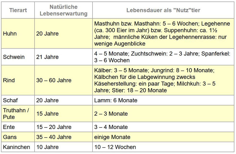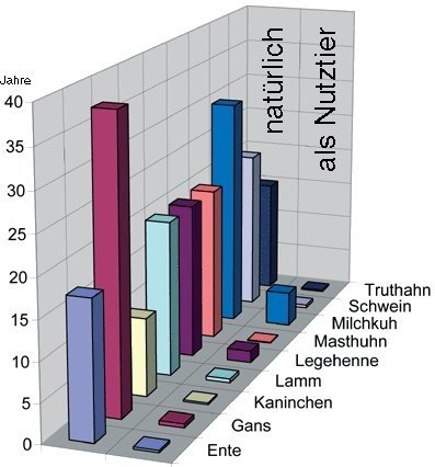 Wie lange "leben" Tiere, die produziert und gegessen werden? Vergleichen Sie mit der natürlichen Lebenserwartung!